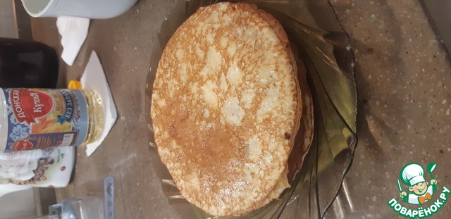 Из данного количества ингредиентов у меня получилось 12 блинов диаметром 26см.