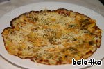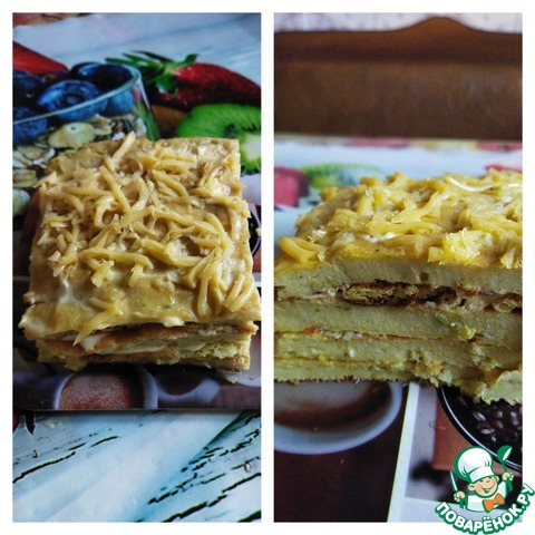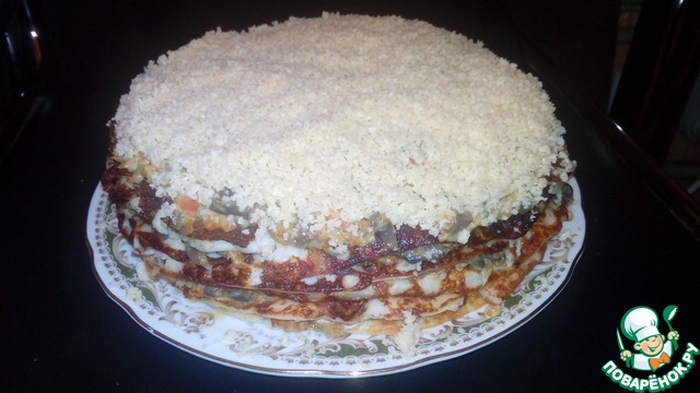 Присыпать мелко натертым сыром. Так чередовать блины, начинку и сыр.
