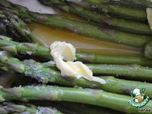 Готовить в разогретой духовке на 180°С 20 минут, если белая спаржа, то минут на 10 дольше. Подавала с запеченой рыбкой под сырной корочкой.