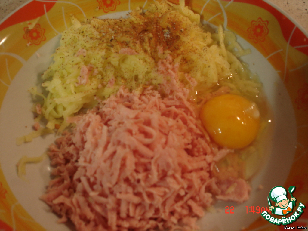 Картофель почистить и потереть на крупной терке, добавить соль, специи, тертую колбаску, яйцо, хорошо перемешать.