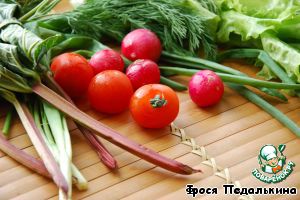 Укроп, зеленый лук и шнитт-лук мелко порезать. Ревень освободить от листьев, нарезать на маленькие кусочки, все перемешать. |