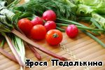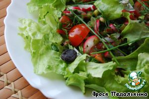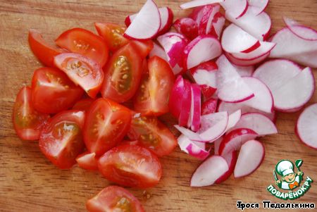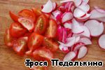 Зелень и салат вымыть, обсушить. Помидоры нарезать четвертинками, редис - полукружками. |
