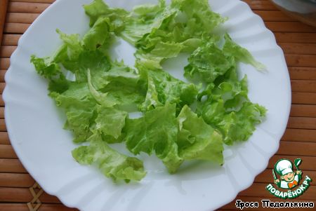 Листья салата порвать и положить на блюдо, |
