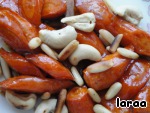 Готовую морковь выложить на блюдо. Посыпать солью, перцем и орехами.