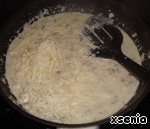 Когда молоко начнет закипать и густеть, добавим сыр.