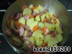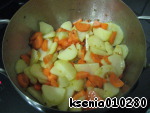 Через 2 минуты добавить морковь и обжарить вместе с картофелем еще пару минут.