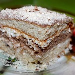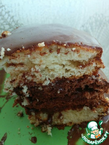 Собрать торт: белый корж - крем - темный корж - крем - белый корж.