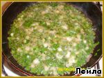 Добавить в сковороду еше немного масла, нагреть его и затем положить зеленый лук. Пассировать лук минуты 2-3