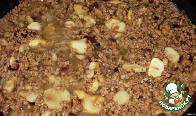 Фарш обжариваем (разминая лопаткой во избежании комков) с луком, добавляем грибы, 100 мл сливок и тушим до готовности