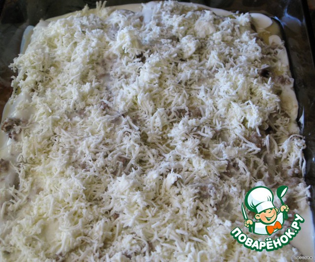 Заливаем соусом (соус должен покрывать трубочки полностью), посыпаем сыром и ставим в духовой шкаф на 40-50 минут.