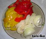 • 4. Нарезать полукольцами лук репчатый и болгарский перец.