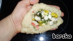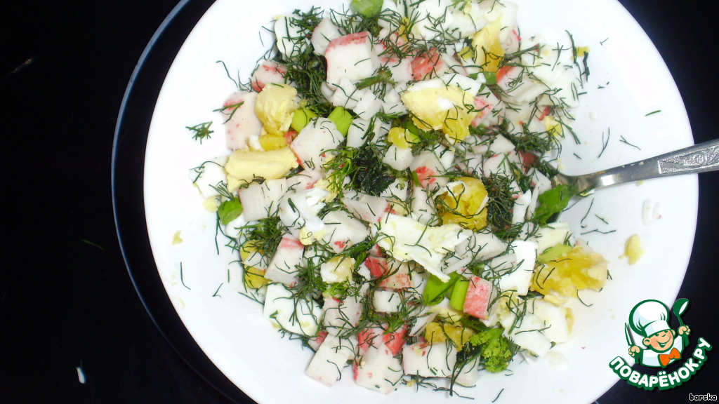 для начинки: нарезать крабовые палочки, яйцо и зелень (по вкусу) и смешать