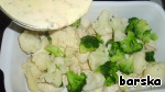 В форму для запекания выложить обжаренное куриное мясо и цветную капусту с брокколи