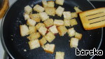 В это время: нарезать тостерный хлеб кубиками и обжарить его в сливочном масле