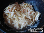 Равномерно распределяем мелко нарезанные кусочки плавленого сыра по всей сковородке, убавляем огонь и, периодически помешивая, ждем, когда он расплавится
