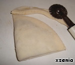 Сворачиваем в два раза, затем еще в два. Должен получиться вот такой уголок. Теперь обрежем лишнее тесто. Одновременно защипывая края.