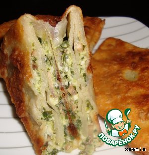 Тесто режем на кусочки, раскатываем каждый из них в тонкий пласт. Выкладываем начинку.