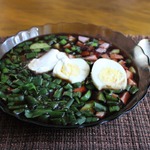 • Раскладываем в порционные тарелки, добавляем холодный квас и сметану, солим по вкусу. Отвариваем картошку. В идеале это должны быть кругляшки, и никто не сможет переубедить меня, добавлять картошку в окрошку. Она должна быть горячей, и есть ее надо вприкуску с холодной окрошкой и, еще лучше, руками. Не надо ругаться, но так вкуснее.