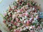 • Нарезаем на маленькие кубики огурцы, яйца, редис и колбасу. Мелко нарезаем зелень.