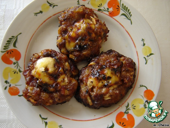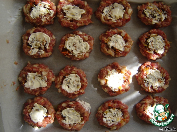 Морковь и лук обжарить на подсолнечном масле (забыла сфотографировать). Из фарша сформировать котлеты, сделать в середине каждой углубление и положить на смазаный подсолнечным маслом противень.