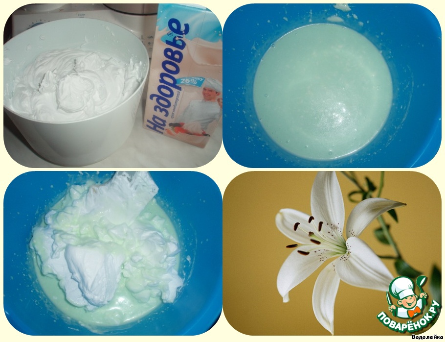 Теперь берем наши сливки и хорошо взбиваем до густоты. Я брала сливки кондитерские (такие, как на фото), они уже идут с сахаром. Если сливки простые, то в них добавить еще сахар (по вашему вкусу).