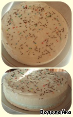 Когда застыл второй слой крема, торт вынимаем, снимаем борта и перекладывает торт на блюдо. Украшаем по желанию. Я просто посыпала верх разноцветной посыпкой.