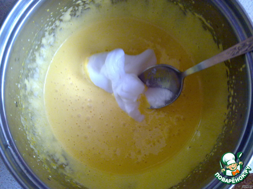 Добавить пару ложек белков к желткам, всыпать муку и все перемешать. Затем выложить все белки и аккуратными движениями снизу вверх вымесить тесто.