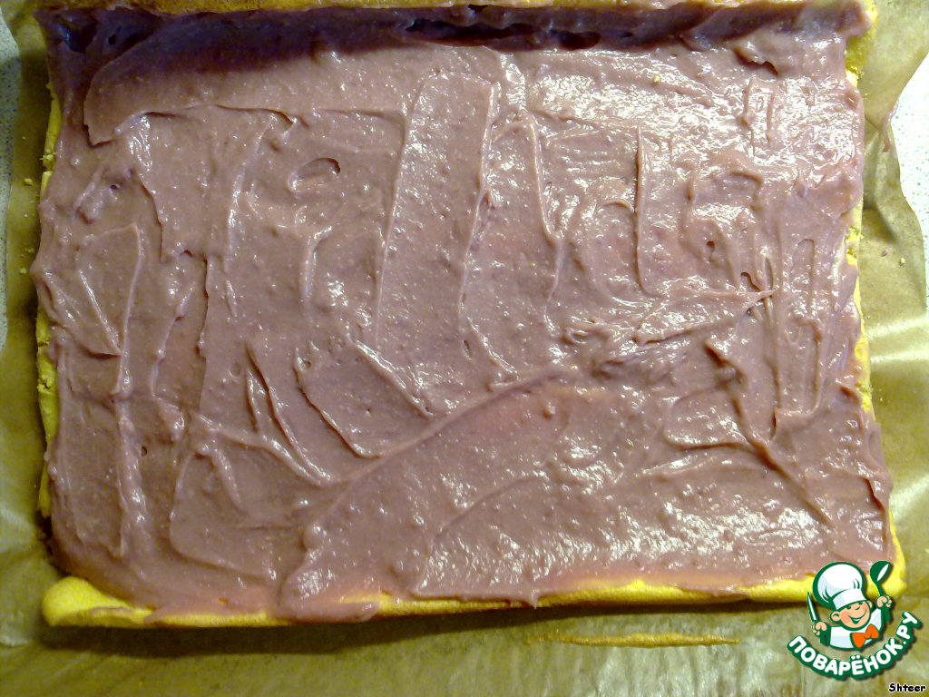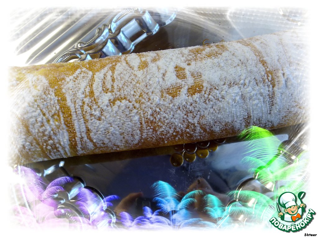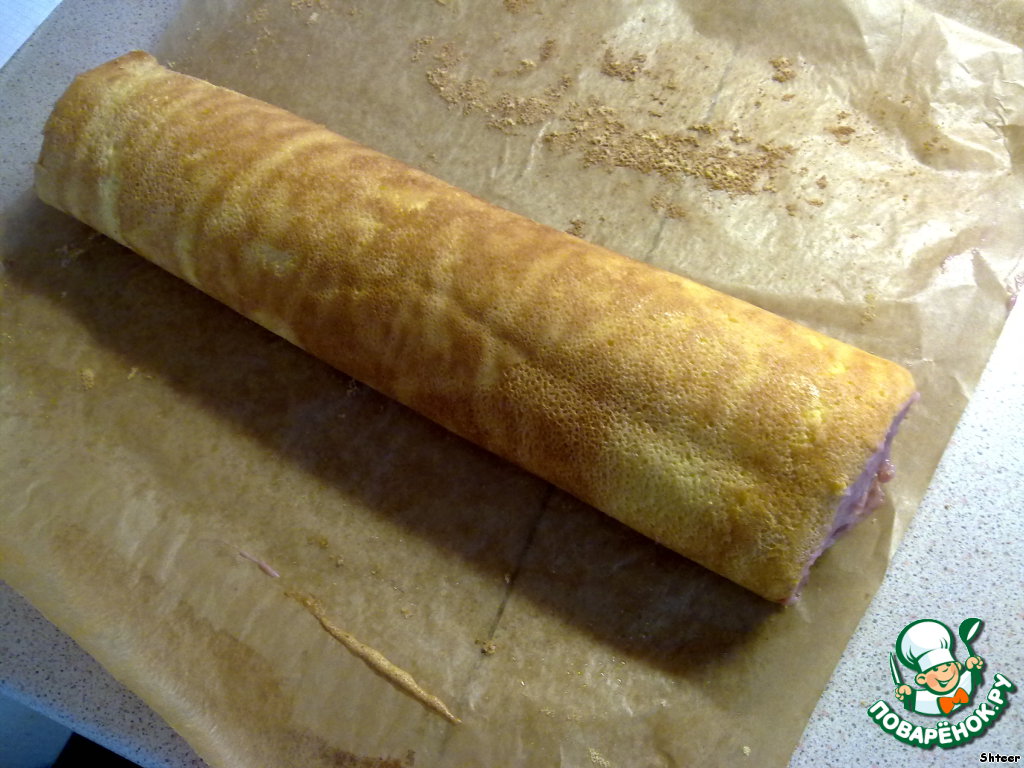 Горячий бисквит вынуть из духовки и свернуть рулетом. Дать остыть.