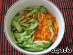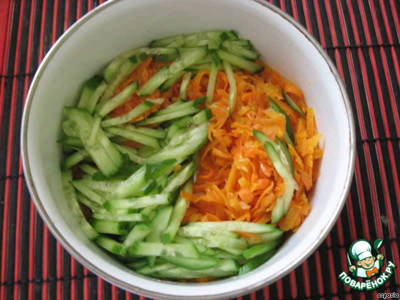 Морковь обжарить на растительном масле, огурец тонко нашинковать соломкой