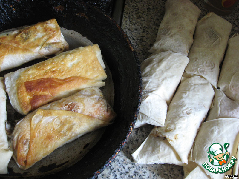 На сковороде обжариваем конвертики из лаваша с начинкой.