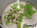 Смешайте в кастрюле воду, вино, перец, имбирь и промытую зелень. Варите на среднем огне 10 минут.
