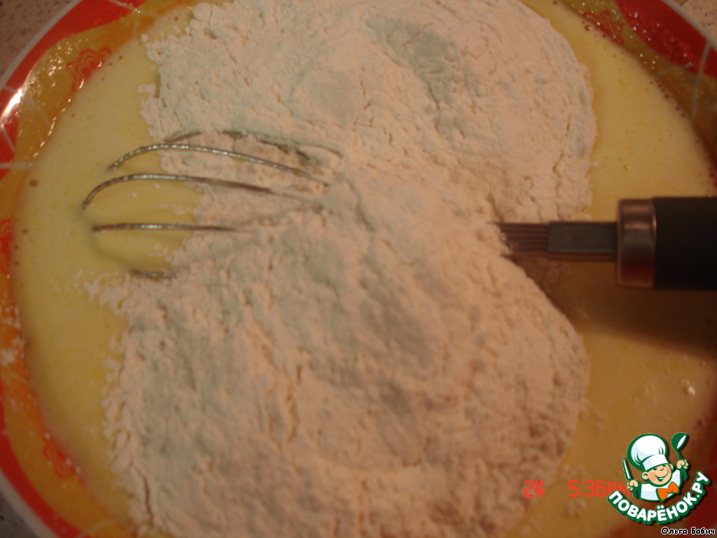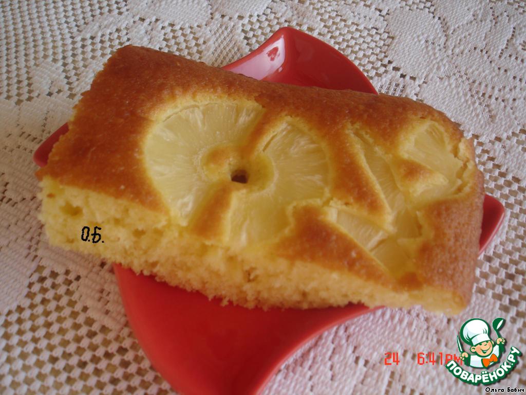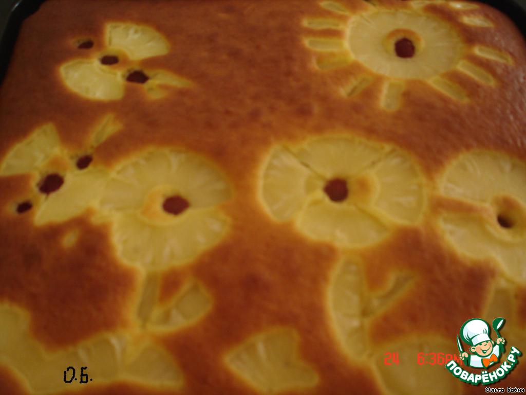 Добавить сок от ананасов 1 стак., ваниль, растопленное, но остывшее масло, муку, перемешанную с разрыхлителем.