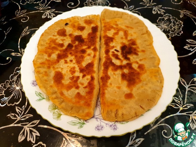 Накрыть второй половиной, защипать края. Формой сделала как обычные чебуреки, т. к. муж хотел именно их, но фарш остался лежать в магазине, поэтому форма осталась, начинка поменялась ))) но для меня такой исход был более вкусный, я без сыра не могу, а вот к мясу равнодушна ))