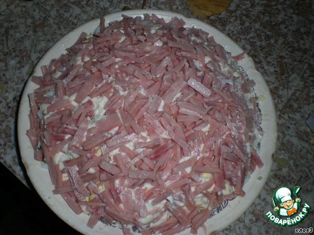Ветчину нарезать тонкой соломкой.