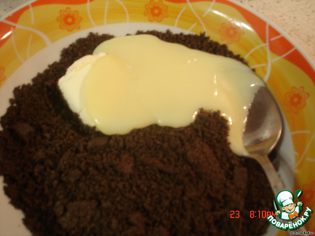 • Печенье перемолоть в блендере, добавить масло и сгущенное молоко, хорошо перемешать