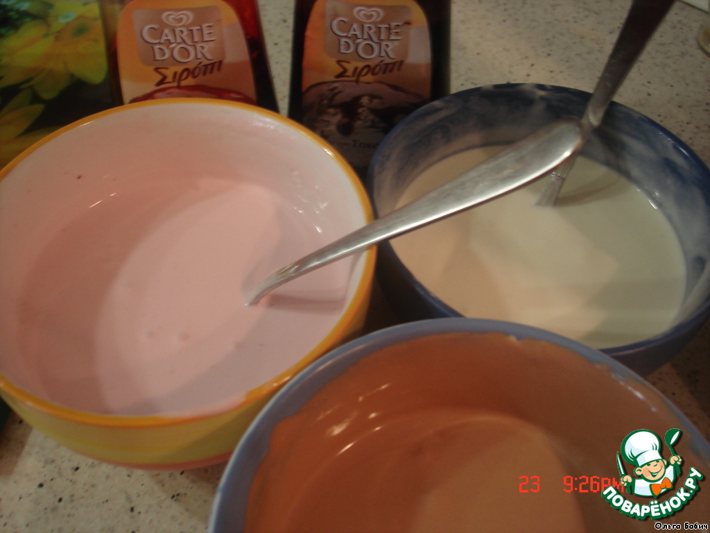 • Взбить сливки, разделить на 3 части, добавить в растаявшее мороженое, одну порцию оставить белой, в 2 другие добавить сироп (у меня вишневый и шоколадный)