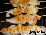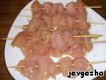 Нанизать на шпажки по два кусочка, дать постоять минут 20
