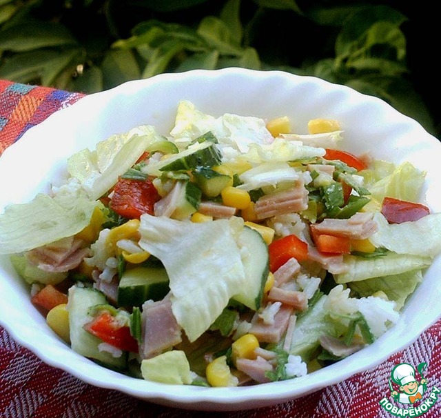 Режем зеленый лук, салат, смешиваем с холодным отварным рисом.