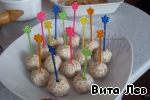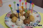 Мокрыми руками скатать шарики, вставить зубочистки или шпажки, или палочки для мороженого