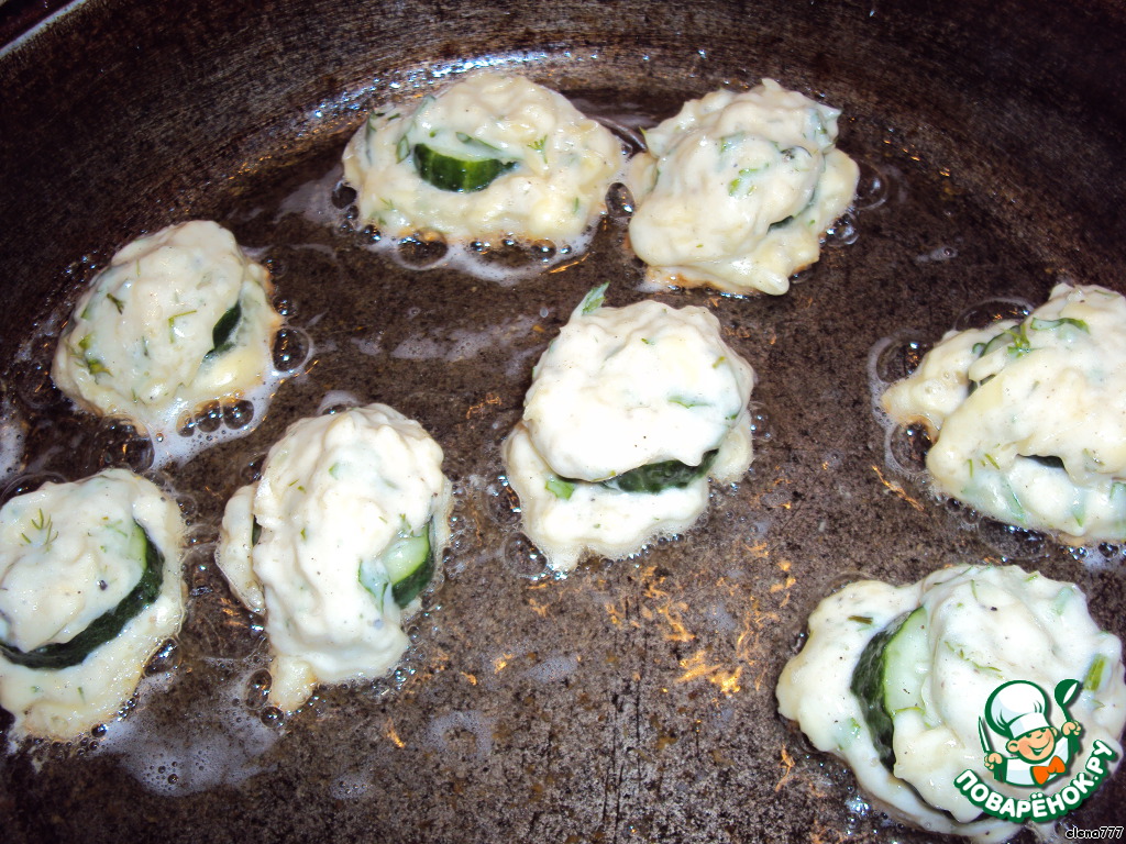 чайной ложкой, смоченной в воде, выложить сырное тесто - по ложке, сверху положить колечко огурца и прижать. Огурчик накрыть ещё одной ложечкой теста. Получаются вот такие пирамидки. -