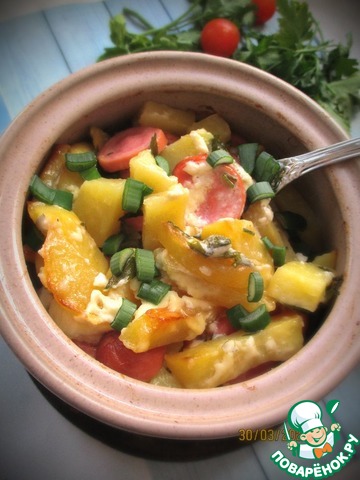 Сосиски нарезала и слегка обжарила на растительном масле. Отправляем их сверху в горшочки.