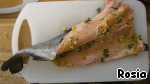 Рыбу со всех сторон хорошо намазать солью, потом маринадом.