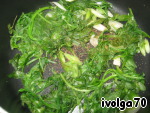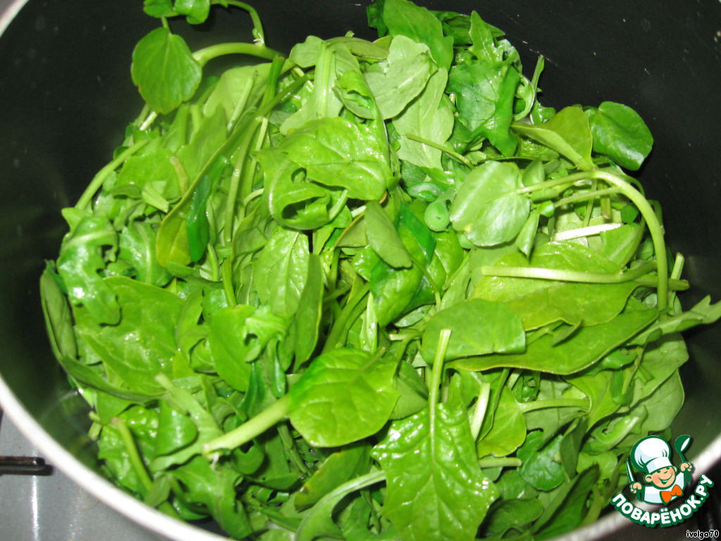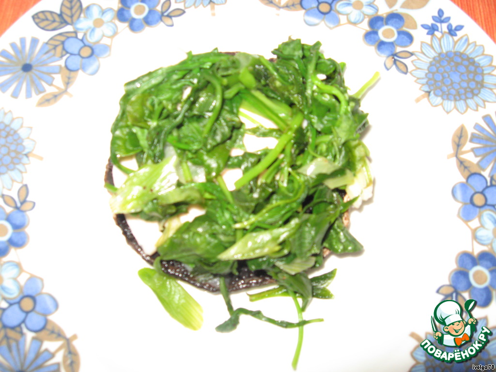 Обжарив 2 минутки, добавляем листья молодого, тщательно промытого и высушенного шпината. Накрываем крышкой и оставляем тушиться 3-5 минут