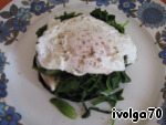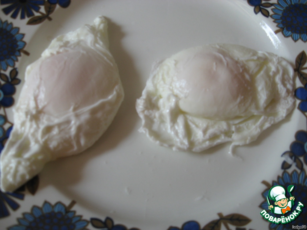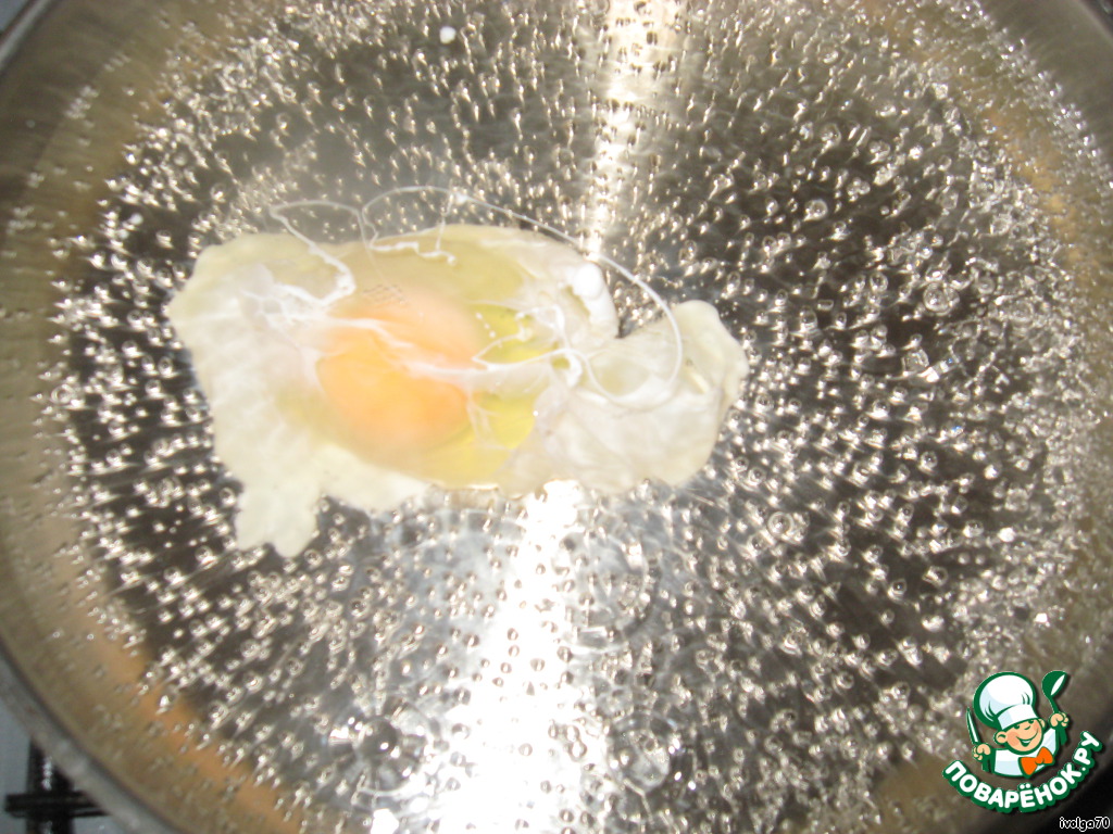 Тем временем.. наливаем в глубокую сковороду до середины воды. Когда закипела, добавляем ложку уксуса и разбиваем яйцо. "Жарим" 3-4 минутки. Ложкой обливаем кипятком яйцо сверху.