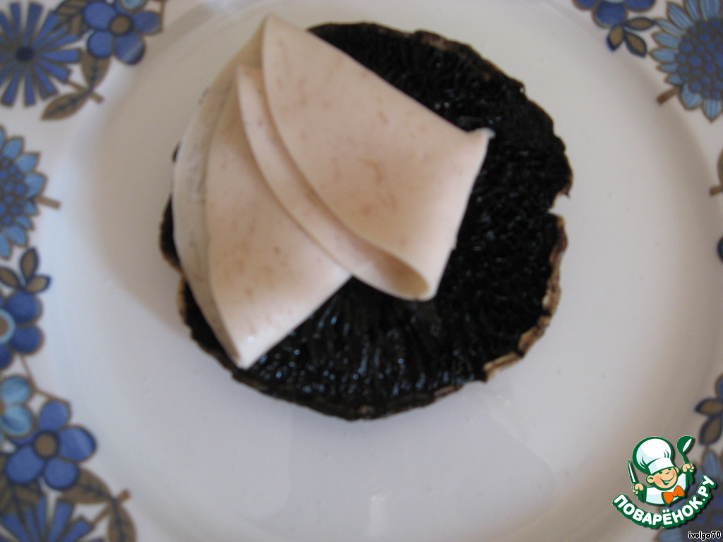На гриб кладем сложенную ветчину