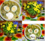 Положить в каждую тарелку фрикадельки. Яйцо тру прямо в тарелку. Мои мужчины любой суп едят со сметаной. Поперчить...