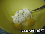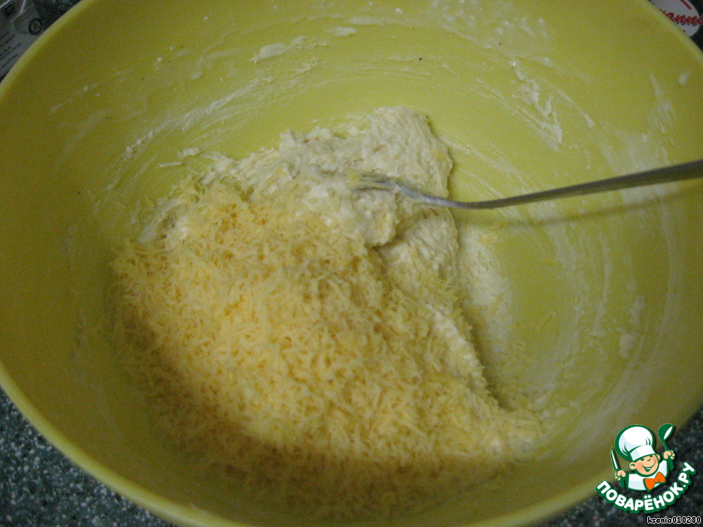 Трем сыр Гауда и добавляем в тесто, перемешиваем.