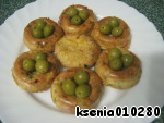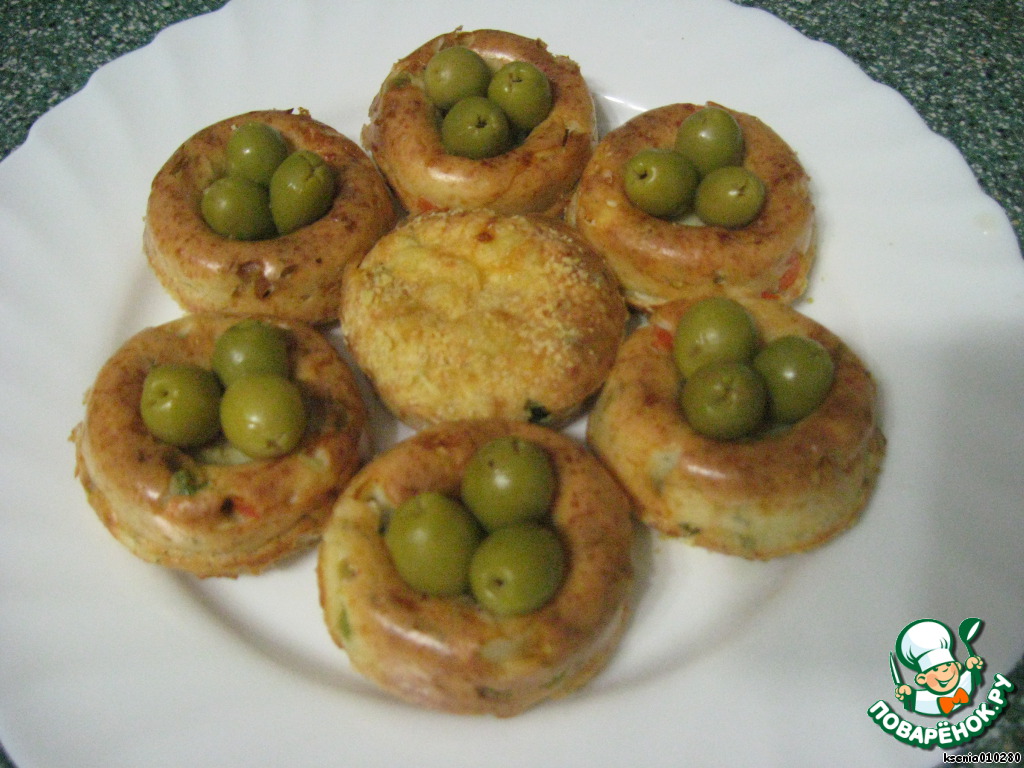 Через 20 минут уже можем наслаждаться сырно-овощной запеканкой. У меня формочки с дыркой, поэтому внутрь можно положить еще какие-нибудь овощи. У меня оказались только оливки.