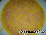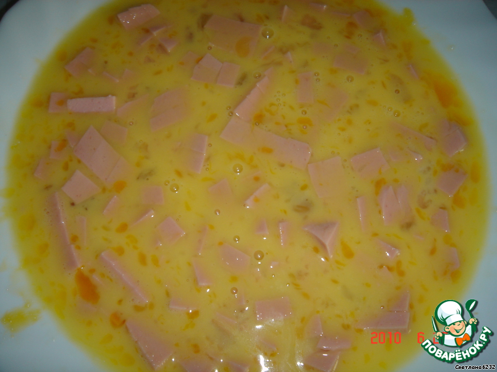 3. Подоготовить начинку: яйца взбить с молоком, посолить и добавить порезаную колбасу или сосиски.