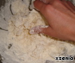 Кипятим воду добавим в нее 2 ст ложки растительного масла. Муку выкладываем в глубокую посуду, вливаем кипяток. Перемешиваем сначала ложкой, потом руками. Дадим тесту остыть. -